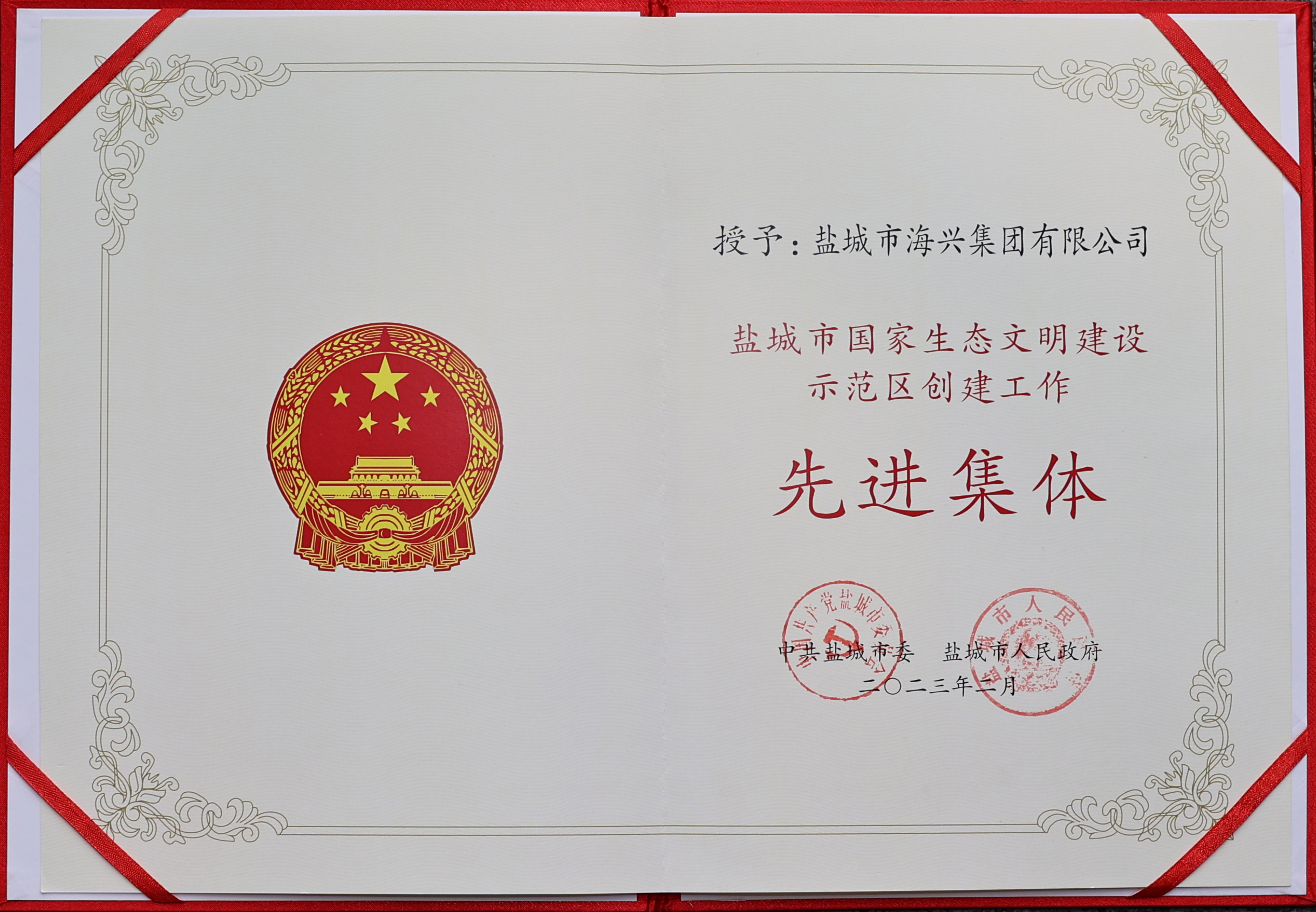 近日,市委、市政府表彰了一批鹽城市國家生態(tài)文明建設(shè)示范區(qū)創(chuàng)建工作先進(jìn)集體和先進(jìn)個(gè)人。其中,海興集團(tuán)榮獲“鹽城市國家生態(tài)文明建設(shè)示范區(qū)創(chuàng)建工作先進(jìn)集體”榮譽(yù)稱號。2023-04-04 -