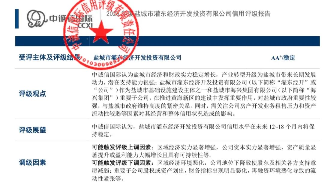 12月31日,集團(tuán)子公司鹽城市灌東經(jīng)濟(jì)開發(fā)有限公司獲得國內(nèi)權(quán)威信用評級機(jī)構(gòu)—中誠信國際授予的AA+主體信用評級,評級展望為“穩(wěn)定”。2026-01-01 -